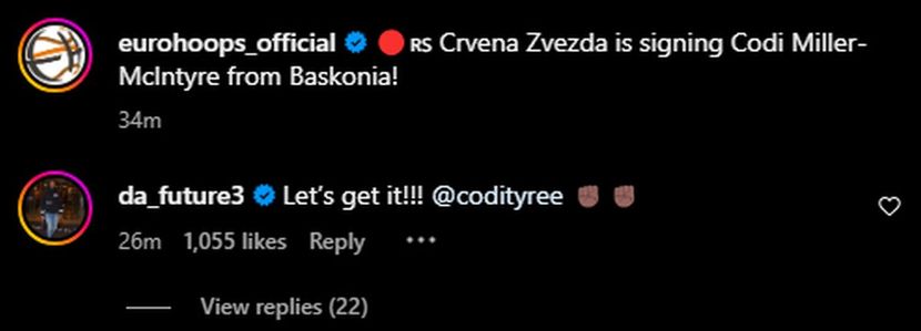 To ushićenje nije mogao da ne pokaže u jednoj od objava na društvenim mrežama na kojoj se navodi kako je Codi Miller-McIntyre novo pojačanje Zvezde.