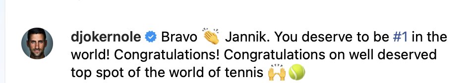 Dan nakon što je izašla osvježena ATP lista, Đoković je čestitao mladom rivalu Sinneru na tome. U poruci na Instagramu je napisao sljedeće: