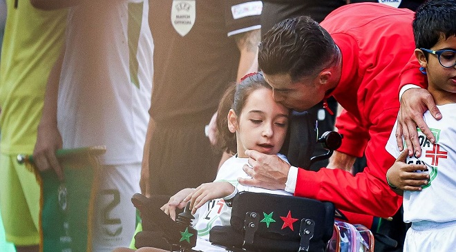 Na teren stadiona u Aveiru izašao je s djevojčicom koja ima poteškoće u razvoju i nalazi se u kolicima. Dok je intonirala himna Portugala, kamere su snimile Ronalda kako drži djevojčicu za ruku, a u jednom trenutku je i poljubio u čelo.