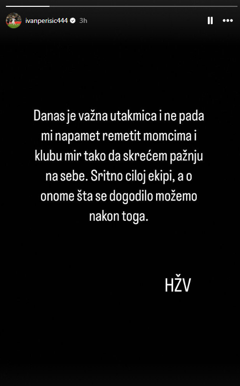 Danas je važna utakmica i ne pada mi napamet remetit momcima i klubu mir tako da skrećem pažnju na sebe. Sritno ciloj ekipi, a o onome što se dogodilo možemo nakon toga. HŽV”, napisao je Perišić na svom Instagram profilu.