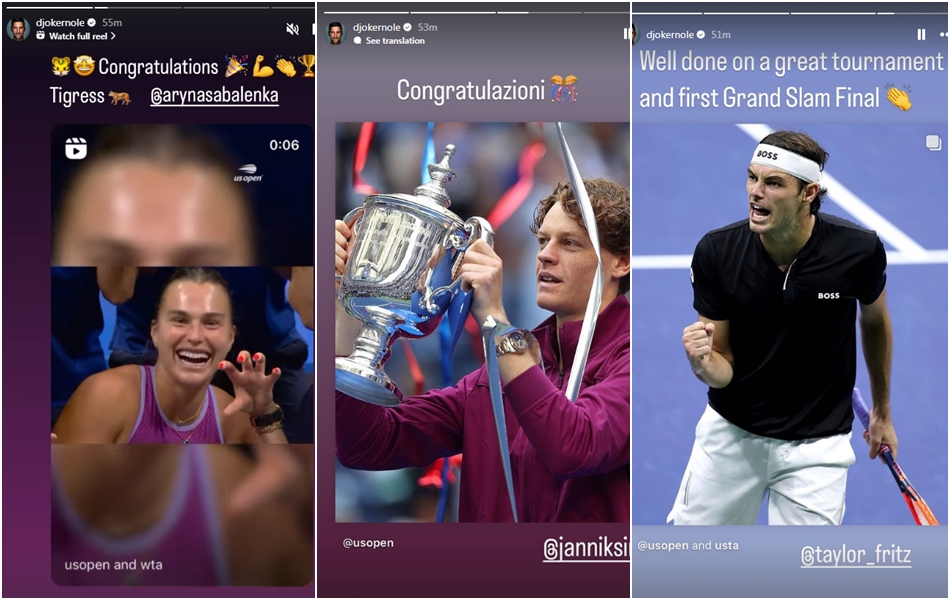 Novak Đoković u posljednje vrijeme sve češće koristi društvene mreže, gdje ima ogromnu popularnost. Sada je iskoristio priliku da na svom Instagram profilu uputi čestitke Aryni Sabalenki i Janniku Sinneru, a nije zaboravio odati priznanje ni Tayloru Fritzu.