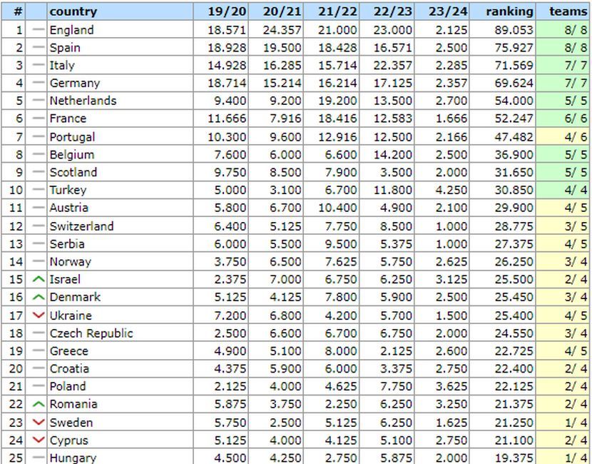 Srbija je već izgubila dva mjesta od početka sezone i trenutno je na 13. mjestu, a ozbiljne izglede da je preteknu imaju Norveška, Danska, Ukrajina, Češka i Grčka, tako da do kraja sezone Srbija može da padne i ispod 15. mjesta, koje donosi dva kluba u kvalifikacijama za Ligu prvaka.