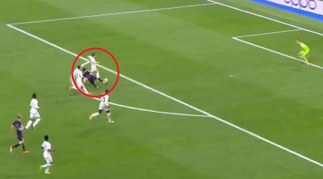 Konrad Laimer je poslao loptu za Aleksandra Pavlovića, koji je mogao sam doći pred golmana Andrija Lunina, ali mu je Modrić dotrčao iza leđa i u zadnji trenutak presjekao dodavanje i spasio Real.