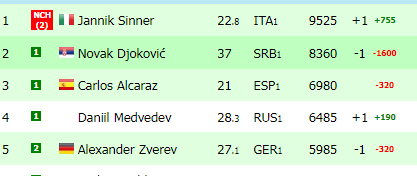 Ostat će uskraćen za 1.600 bodova i prvo mjesto na ATP listi koje će od ponedjeljka pripasti Janniku Sinneru. Prema ATP Live tabeli Đoković ima ukupno 8360 bodova, dok Sinner u ovom trenutku ima 9525 bodova i eventualnom titulom na Roland Garrosu može doći i do visokih 10.725.