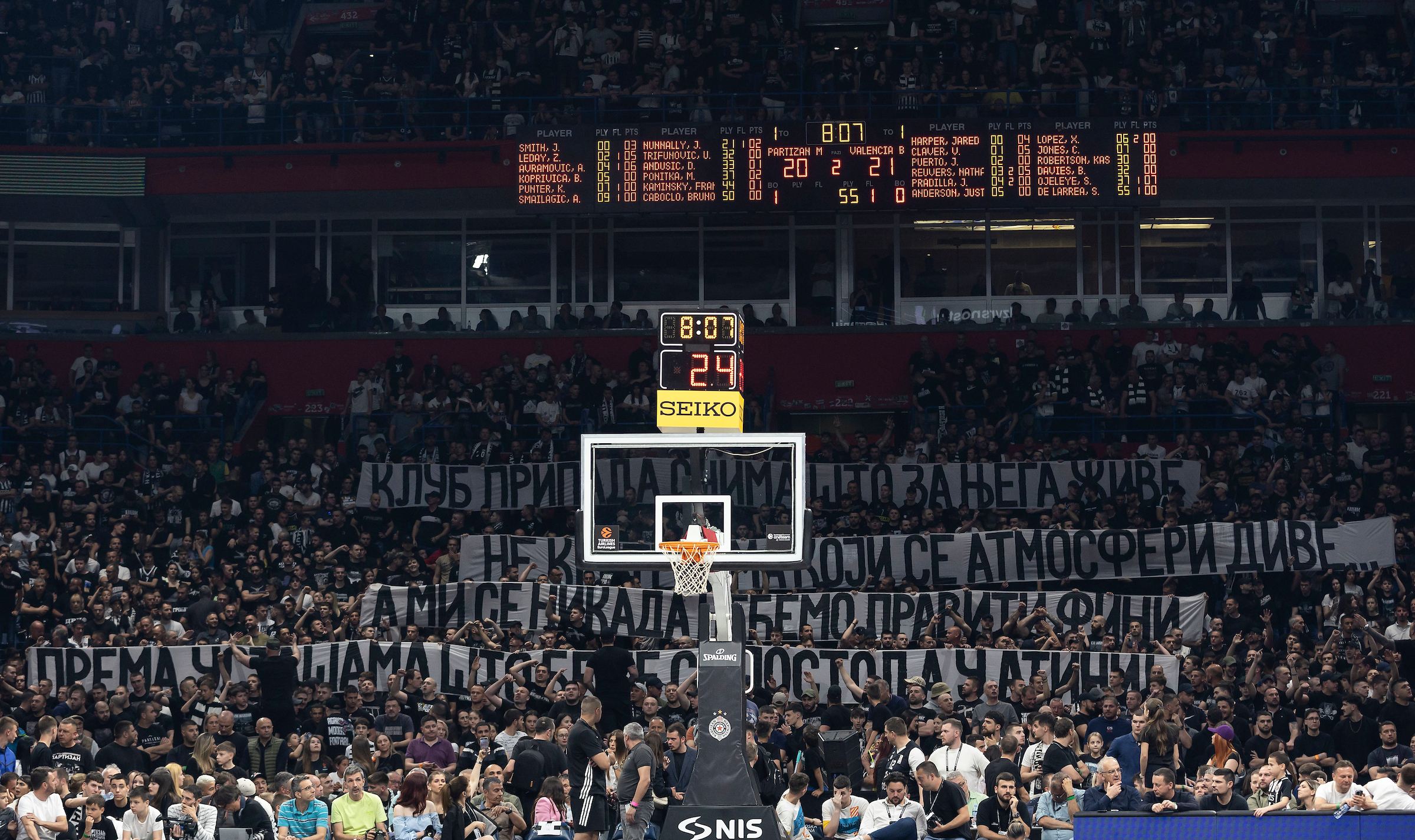 To nije spriječilo navijače da ispune dvoranu protiv Valencije, pa su po običaju pozdravili Obradovića, a pomalo čudna situacija se desila kada je dio navijača počeo da vrijeđa Dina Rađu.