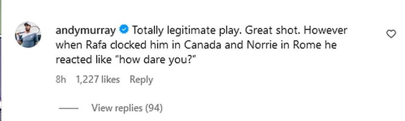 Totalno legitivan potez. Odličan udarac. Kako god, kada je Rafa pogodio njega u Kanadi, a Norrie u Rimu, on je reagovao sa “kako se usuđujete to da uradite”?”, napisao je Murray očigledno “bockajući” srpskog tenisera, kome je posebno zasmetao potez Norrija kada su igrali u Rimu.