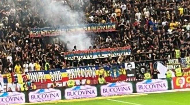 Rumunski navijači istakli su parolu “Kosovo je Srbija”, pa je sudija odlučio prekinuti ovaj susret. Nema informacija da li će se utakmica nastaviti.
