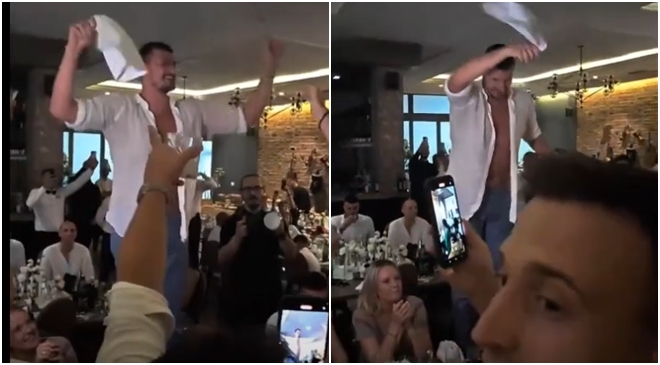 On se u jednom trenutku popeo na stolicu sa otkopčanom košuljom i zapjevao pjesmu “Prokleta je Amerika”. Pored Jokića je bila i supruga Natalija, a kako je to izgledalo možete pogledati ispod: