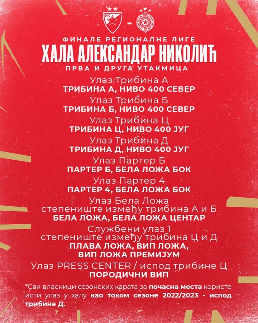 Kapije dvorane bit će otvorene dva sata prije početka meča, a KK Crvena zvezda apeluje na sve koji budu dolazili u dvoranu, da se ka njoj upute ranije, zbog vrlo detaljnih kontrola koje će biti sprovedene na svim ulazima.”